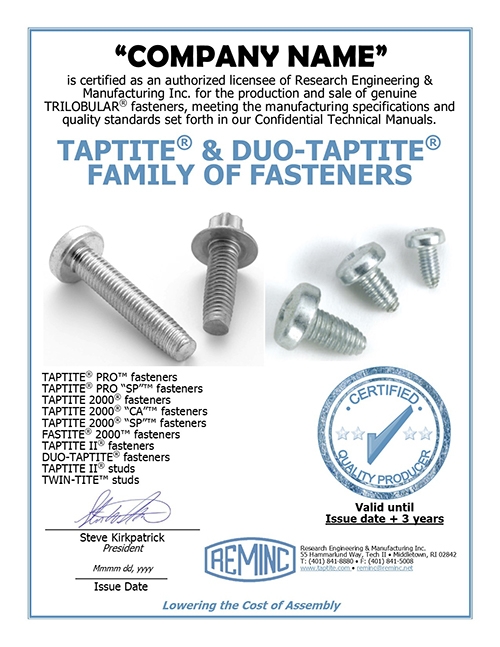 Our auditing process is an important component of the licensing program that assures REMINC and the licensee that all trademarked products are within technical conformance. It also ensures end-users receive acceptable functional parts when ordered as trademarked fasteners from any authorized licensee. This quality assurance of TAPTITE® and REMFORM® fasteners allows REMINC to confidently state we are “Leaders Lowering the Cost of Assembly.”